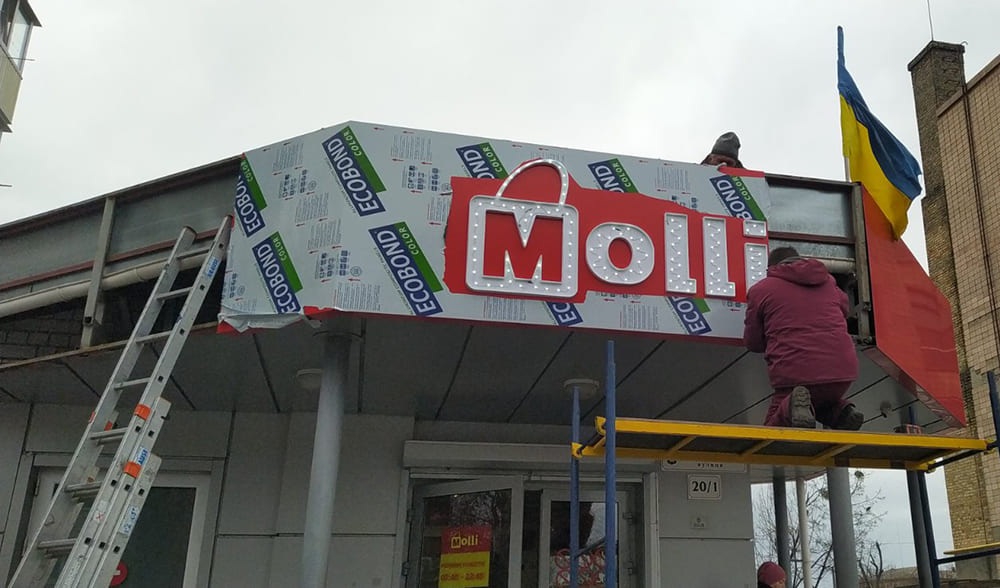 У світі бізнесу важливо не лише привертати увагу, але й залишати невимовне враження. Ми, в РГ Фламінго, віддані створенню унікальних та вишуканих вивісок, які виведуть ваш бізнес з тіні та приведуть до нових висот. Однією з наших робіт була реставрація вивіски магазину Molli у мальовничому місті Черкаси.